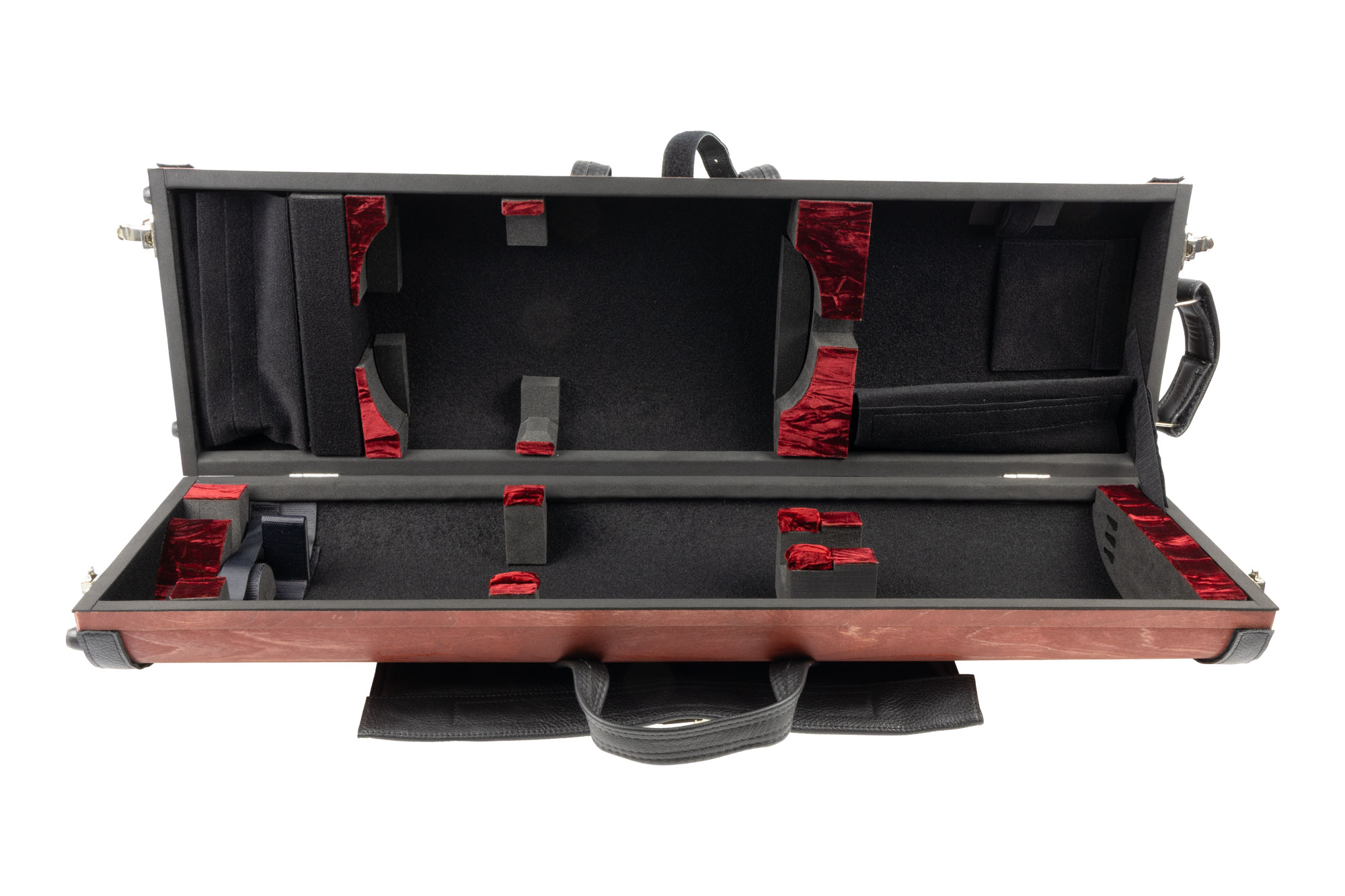 Der ovale Koffer bietet optimalen Schutz für Geigen. Ausgestattet mit Scharnieren und Verschlüssen aus Edelstahl, hängt die Geige dank Gummipuffern mit freiem Korpus und Schnecke frei. Bis zu vier Bögen finden zwischen stoßdämpfenden Gummipuffern Platz, sodass sich weder Haare verfangen noch die Bögen die Geige berühren können. Am Schneckenende befindet sich ein großzügiger Stauraum mit Gurten zur Befestigung einer Schulterstütze. Ein separates Fach am anderen Ende bietet Platz für Zubehör. Die Kofferwände sind absolut formstabil und verwindungssteif.